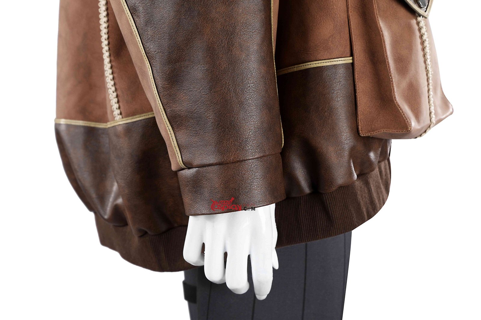 • Leg Armor: Distressed PU faux leather (non-stretch), composite leather (non-stretch)
