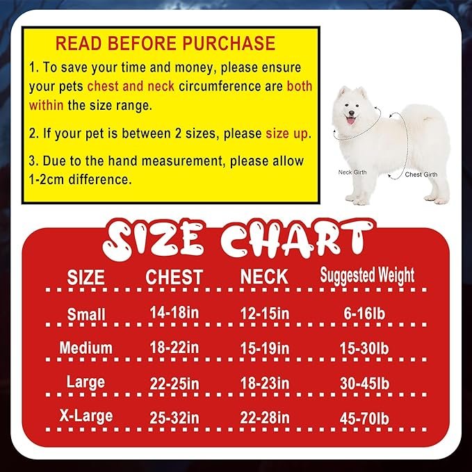 - Multiple Sizes: This set of Halloween costumes for dogs are designed in 4 sizes, suitable for all breed sizes dogs and other pets. You can adjust the neck and chest by tying the elastic ropes to fit your pets better.To save your time and money, please refer to the size chart before ordering.