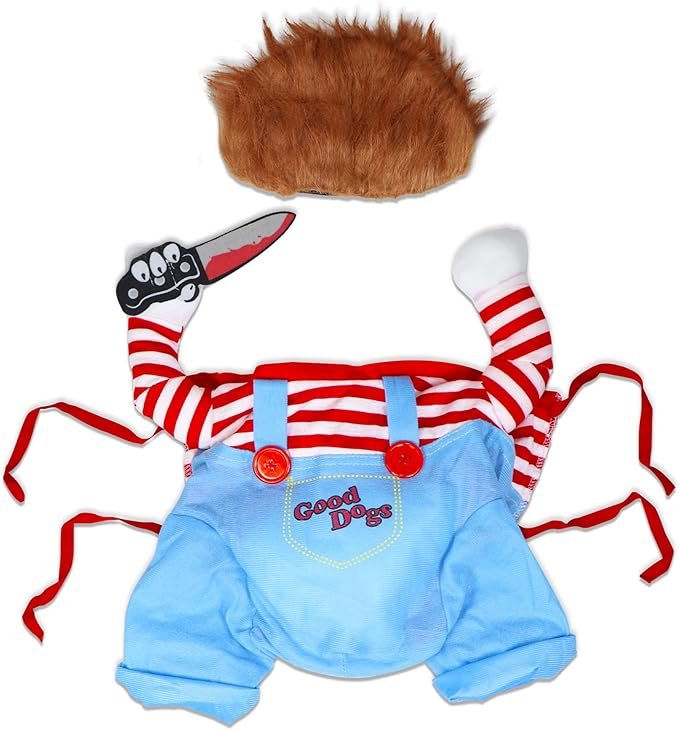 - Deadly Dog Costume:The dog Halloween clothes come with 2 arms full of cotton, when your dogs walks,the arms will sway naturally. Printed with “Good Dogs”pattern, it will make your dog funny and adorable. The brown dog wig and knife props are separate accessories. The dog costume will make your dog look like a real scary killer, become the hit of family on Halloween.