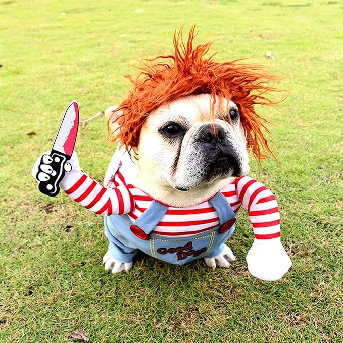 - Dog Halloween Costumes: The deadly doll dog costume contains 1 dog clothes, 1 brown dog wigs and 1 knife prop. This Halloween dog costumes is ideal for dressing up your dogs, make it stand out on Halloween party.