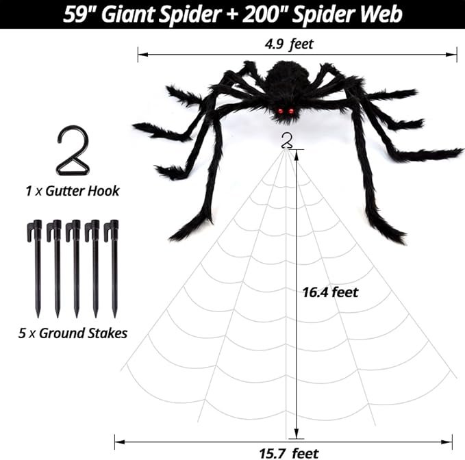 - GIANT AND VALUE PACK: Come with 200\” Triangular giant spider web and 59\” Halloween spider, huge size make it looks real from far away, great addition for around the house. Placed it in outdoor yards & homes, give your neighbors and friends some surprises! So affordable pack to save time, why not get it?